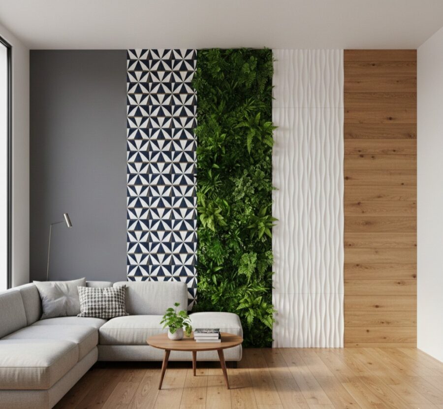 - ترکیب چوب و گیاه: استفاده از ترمووود یا پنلهای چوبی در کنار دیوار سبز مصنوعی. این ترکیب تعادل بینظیری از گرما و طراوت ایجاد میکند و برای ورودی آپارتمان یا فضای ناهارخوری عالی است.